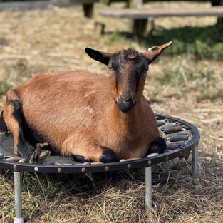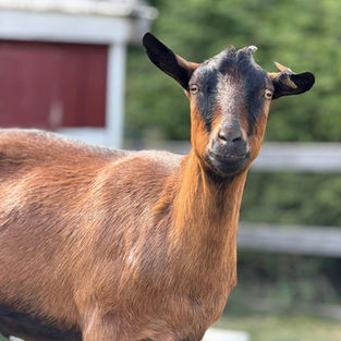 Theo arrived at the farm in May of 2024. He's the largest goat on the farm and likes to flex his muscles at snack time.